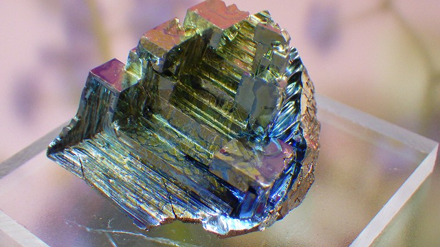 人工的に作られた虹色に輝くビスマスの結晶です。